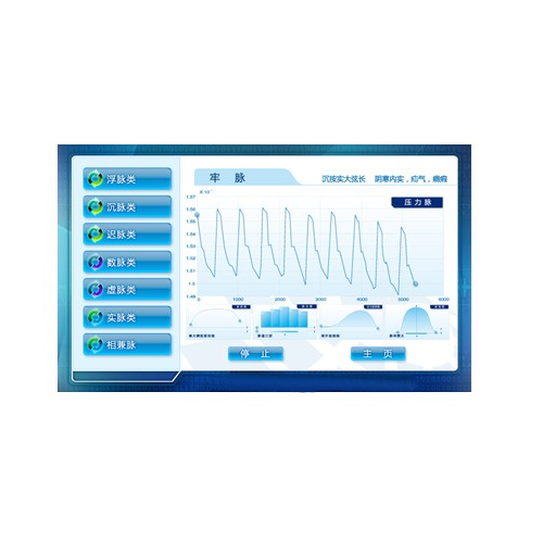 具有可視化7真彩液晶觸摸屏幕,顯示脈象圖譜(壓力趨勢圖,壓力脈圖、壓力趨勢圖、脈長圖、脈寬圖)及文字內容;
