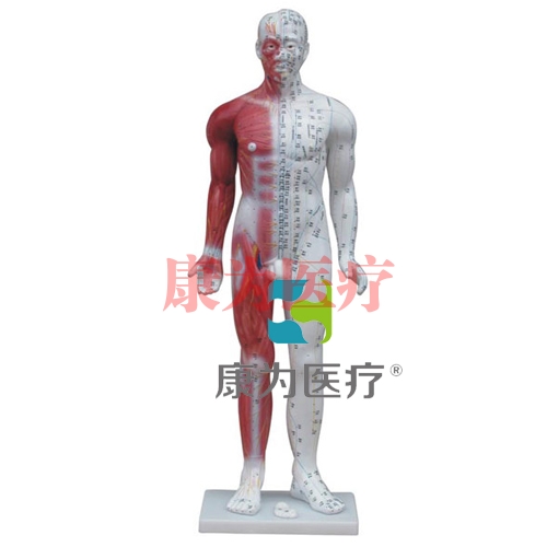 高85cm十四經(jīng)穴標(biāo)準(zhǔn)針灸模型,一側(cè)示肌肉、皮神經(jīng),一側(cè)示十四經(jīng)脈、穴位及經(jīng)外穴。