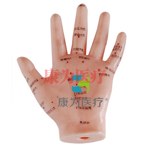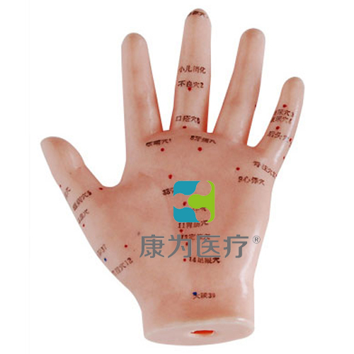 用軟而光亮的PVC制成的大規(guī)格的人手模型,顯示手背上的20個穴位和手心上13個穴位,穴位用漢字或數(shù)字標注。附中英文使用手冊。