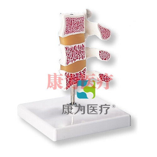 脊椎典型病變模型(骨質(zhì)疏松癥模型)由3塊切開的腰椎組成,最上面一塊腰椎顯示正常的腰椎及其骨結(jié)構(gòu)。