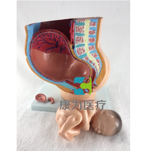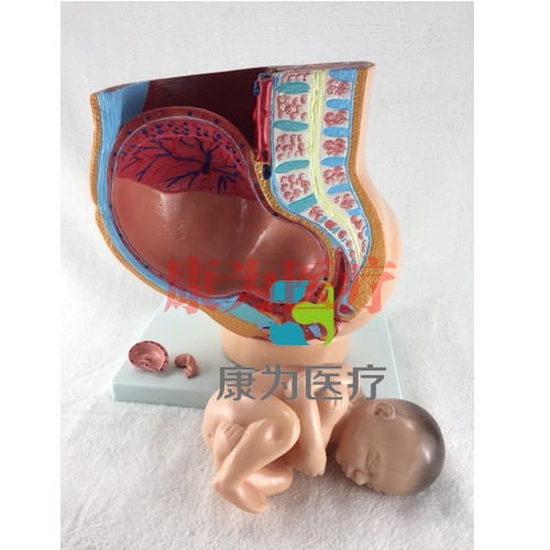 女性盆腔矢狀切面模型由骨盆子宮和妊娠九個月胎兒兩個部件組成,并顯示子宮、陰道、膀胱、直腸和胎兒、羊膜、胎盤、臍帶等結構。