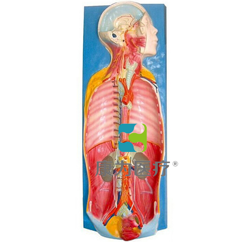 自主神經(jīng)解剖模型主題為人體的頭頸及軀干,頭部作矢狀切面至眉弓高度作水平切,顳下部除去上方的顴弓,顳下部的腮腺及部分軟組織,頸部示剝離軟組織,胸腹部沿腋前線削開胸腹壁,除去胸腹腔內(nèi)臟,保留氣管、主動脈、腎、腎上腺以及直腸。