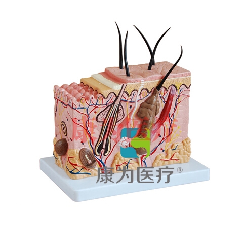 本模型顯示了不同層面的人類皮膚層次及毛發(fā)結構,展示了毛發(fā)、毛囊、脂腺、汗腺、皮膚感受器、神經(jīng)和血管。