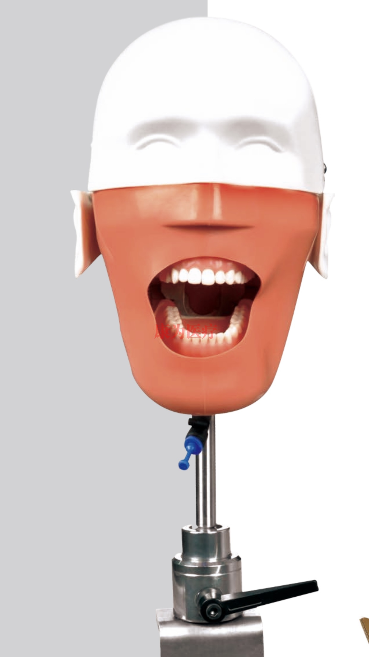 該模型由頭模,金屬支撐桿,基底座和鏍絲組成,可使頭模牢固固定在牙科診療臺(tái)上。頭模后下方有調(diào)節(jié)手柄可任意調(diào)節(jié)和固定頭模位置,頭模后上方調(diào)節(jié)手柄可使頭模上下部分分離??谇话惭b仿真標(biāo)準(zhǔn)全口牙模。帶可換合架P-3的KANGWAY?仿真頭顱P-6,這種新型仿真頭顱繼承了傳統(tǒng)仿真頭顱P-5/3的優(yōu)點(diǎn),并在許多細(xì)節(jié)上進(jìn)行了改進(jìn)。合架模擬髁突關(guān)節(jié)腔的解剖形態(tài),可模擬人體咀嚼功能運(yùn)動(dòng)時(shí)髁突的三維運(yùn)動(dòng)曲線軌跡。