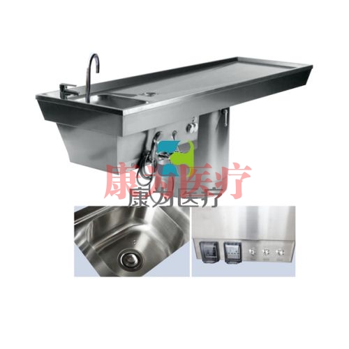 “康為醫(yī)療”圓形底座固定式法醫(yī)解剖臺(tái)(帶洗手池,冷熱水沖淋),不銹鋼法醫(yī)解剖臺(tái)