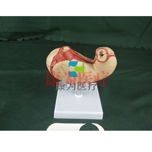 該模型由胃冠狀剖面兩個部件組成,顯示胃的形態(tài)賁門、幽門、胃底、胃體、胃小彎、胃大彎、角切跡、幽門竇、幽門管和胃壁的組織結(jié)構(gòu)粘膜層,胃道、幽門瓣、粘膜下層、肌層、幽門插約肌、漿膜以及胃的血管和迷走神經(jīng)等結(jié)構(gòu)。置于塑料底座上