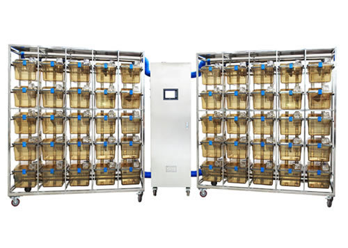 07.采用靜壓微風(fēng)技術(shù),對每個籠盒獨立送氣,防止交叉感染;籠架上設(shè)置有進(jìn)出風(fēng)關(guān)閉閥,主機可自動調(diào)節(jié)每盒的風(fēng)速,使整架每個籠盒的壓差均勻;