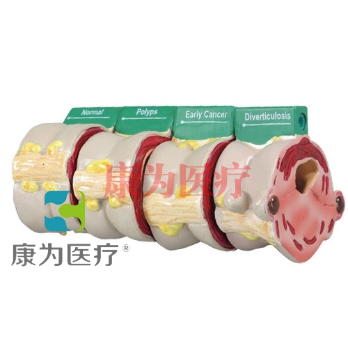 結(jié)腸切面模型是人結(jié)腸的四片結(jié)腸橫截面;顯示正常和各種疾病狀況。 包括在正常解剖結(jié)構(gòu)包括:漿膜,肌肉,粘膜,半月褶,絳蟲。 代表的疾病是:息肉,癌癥,憩室炎和結(jié)腸炎。