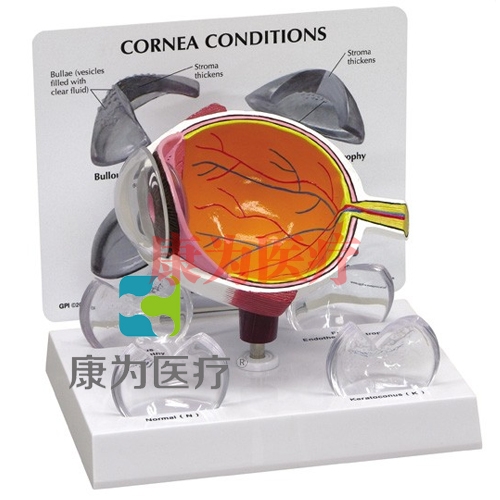 病變眼解剖模型顯示內(nèi)部解剖。 包括四個可互換角膜顯示各種角膜病癥,包括:大皰性角膜病變,富氏內(nèi)皮營養(yǎng)不良,圓錐角膜和正常。 鏡片和角膜是可移動的。