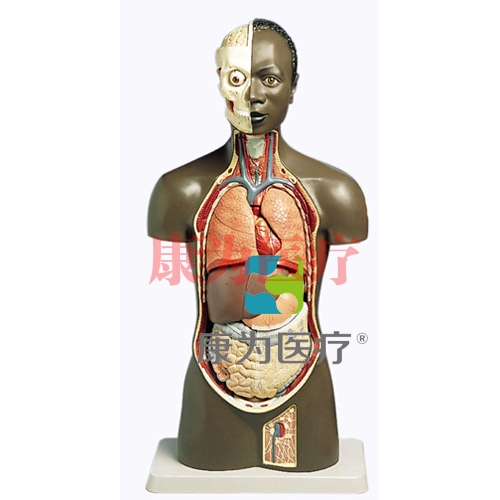 這款軀干模型為黑皮膚,帶有典型的臉部特征,頭部一半開(kāi)放顱和腦。下列部分可拆卸: 眼球帶視神經(jīng) ,2部分肺葉 ,2部分心臟,2部分胃,肝臟帶膽囊,前半腎,整套腸帶開(kāi)放盲腸