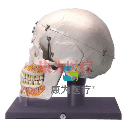 此款人顱全真復(fù)制品質(zhì)量一流。頭蓋骨可拆卸,顱底可垂直分開。前竇,正中板和犁骨用板固定,并可打開觀察側(cè)鼻壁和楔竇。左半顳骨可拆卸并在鼓膜處折疊。上頜骨和下頜骨均打開以展現(xiàn)牙槽神經(jīng)。右半顳骨可打開展現(xiàn)乙狀竇,臉部神經(jīng)管和半圓管。增加骨板定位于上頜竇和右下頜,因此可觀察下頜前磨牙和磨牙的牙根。天然咬合肌和每顆牙齒的拆卸替換使此款模型受到牙科醫(yī)生的特別青睞。