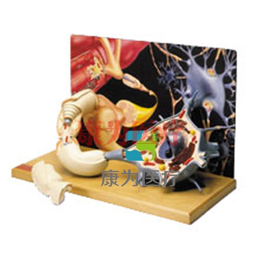 這款模型放大2500倍,三維展示了內(nèi)環(huán)境交互神經(jīng)元和骨骼肌纖維內(nèi)的運(yùn)動(dòng)神經(jīng)細(xì)胞。神經(jīng)元膜被切除,以展現(xiàn)細(xì)胞外結(jié)構(gòu)、小器官和細(xì)胞體的其他組成。染色體聯(lián)合及糖脂磷繞軸與郎飛氏結(jié)從神經(jīng)元面突出。軸切面可移開(kāi)觀察,糖脂磷和神經(jīng)緊繞層以及構(gòu)成他們的神經(jīng)梢。置于木基架上。