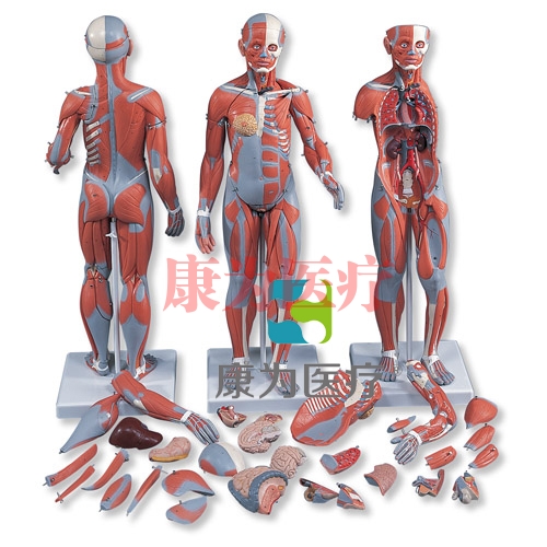 人體全身肌肉解剖模型。84厘米高,占地小,能充分顯示人體肌肉和內部器官。細節(jié)部分手工制成,21個部件可拆卸或分解,價格合理,色彩逼真。模型完整,帶有基架和多種語言的解碼卡,由以下部分組成: 5塊臂/肩肌 ,8塊腿/臀肌 ,可拆卸胸腹壁及一只臂以供詳細研究,以及總計400多個編號的結構。