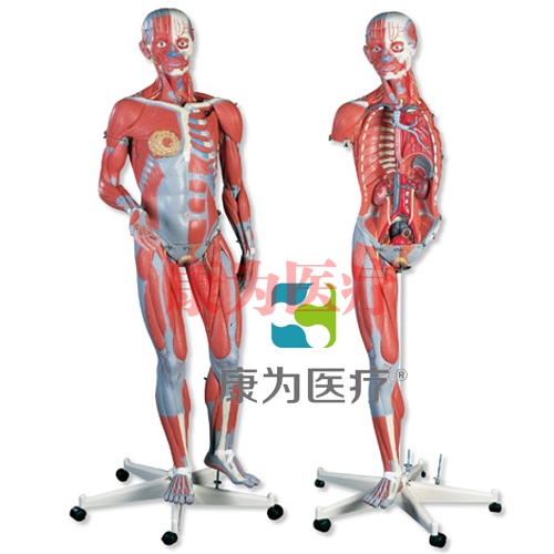全球最佳教學工具!高度138厘米,是實物的3/4,除精確詳解人體主要神經(jīng)、血管、組織和器官外,復(fù)制了人體表層和深層肌肉結(jié)構(gòu)。內(nèi)臟可拆卸(共45塊)以展現(xiàn)人類形態(tài)學的基本聯(lián)系。打開顱蓋可觀察內(nèi)部顱結(jié)構(gòu)和可拆成3部分的腦。肝下方可見肝囊和膽管??筛Q見腸、胃、肺、心臟和腎,臂和腿的13塊不同肌肉可拆卸觀察。還可替換各生殖器插件及女性乳腺。662個解剖結(jié)構(gòu)諸如肌肉、血管、神經(jīng)和器官被編碼,并附多種語言的說明。 形象逼真的手工著色,并置于實用的旋轉(zhuǎn)基架上。還可分拆成: ?5塊臂/肩肌肉 ?8塊腿/臀肌肉 ,5部分頭,帶腦 ,2肺葉,每個2部分 ,2部分心臟 ,2部分胃,2部分腸 ,可分拆2部分女性和4部分男性生殖器插件 ,?可分拆臂、腿、頭和胸腹壁供詳細研究。