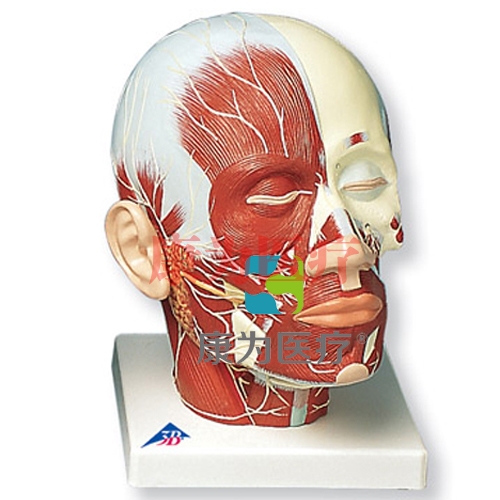 這款模型展現(xiàn)了頭部和頸部的表層肌肉: 腮腺 ,頜下腺(右半) ,深層?。ㄗ蟀耄?,下頜部分打開顯示 ,展現(xiàn)神經(jīng)。