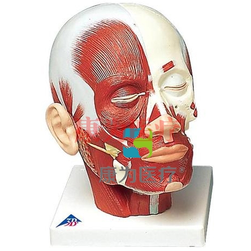 這款模型展現(xiàn)了頭部和頸部的表層肌肉: 腮腺, 頜下腺(右半) ,深層肌(左半) ,下頜部分打開顯示。