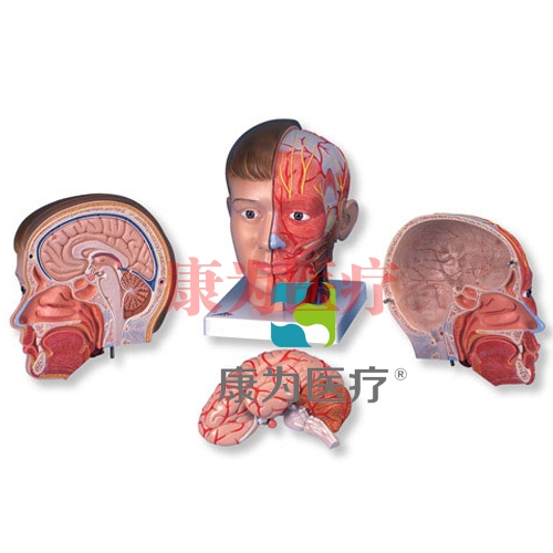 實物大小的中分頭顱,左半部顯示了肌肉帶神經(jīng)、血管和骨結(jié)構(gòu)。半腦可拆卸。頭部安裝于可拆卸的頸部上,此頸部被平面及斜面切。置于基板上供貨。