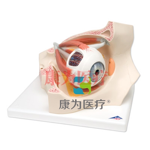 這款模型展示了眼和視神經(jīng)在眼窩(底和中壁)里的位置??煞纸鉃椋?兩半鞏膜及視神經(jīng)和眼肌;角膜 ;晶狀體;玻璃體;上直肌 ;外側(cè)直肌置于基板上。