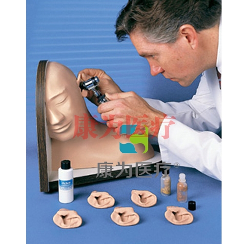 這款模型可用于耳內(nèi)檢查的練習(xí)。由一個頭和6只可替換的耳朵組成,耳由彈性材料制成,內(nèi)外結(jié)構(gòu)極為逼真。其中5只耳朵著色,供不同的病理診斷,未著色的耳朵用于練習(xí)清除耳垢。模擬器提供兩小管人造模擬耳垢, 9個35mm幻燈片(5個表現(xiàn)了如下病理,4 個由W44123補充說明),以及手提箱,不帶耳鏡??蓹z查如下健康和病理狀態(tài): 正常的鼓膜, 粘液性中耳炎 , 有液體滲出的嚴重中耳炎, 慢性穿孔中耳炎 ,正常鼓膜與斜面耳道。