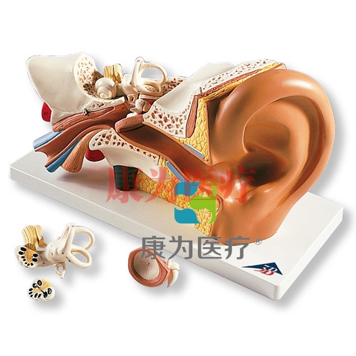 展示外耳、中耳和內(nèi)耳。鼓膜帶錘骨和砧骨,以及耳迷路帶鐙骨、耳蝸、聽覺和平衡神經(jīng)都可拆裝。置于基架上。