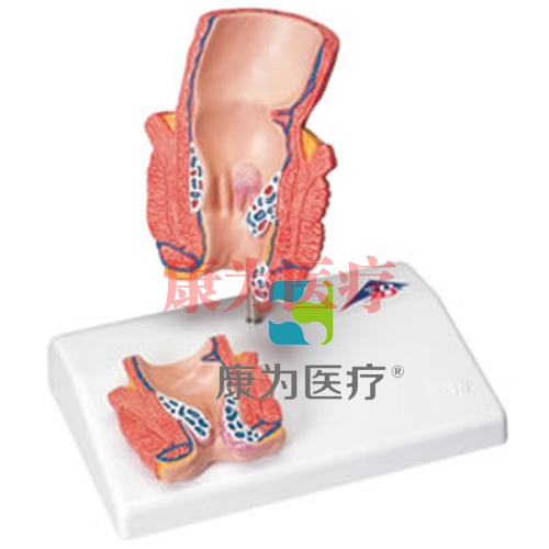 這款模型用來為病人解釋痔瘡的病理。實物大小,展示了直腸的前段。另外在基座上還有一稍微縮小一些的模型。除了直腸的一些解剖結構(肛門括約肌、粘膜、靜脈血管網),它表現(xiàn)了1期和2期的內痔,以及外痔。另外的小模型展示的是3期和4期的痔瘡。置于基架上。