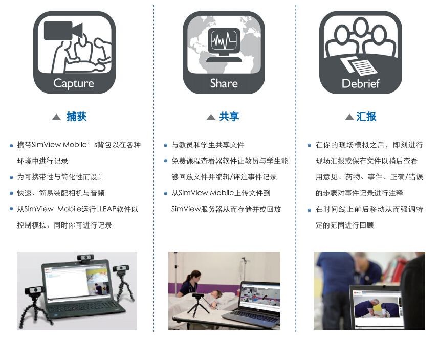 SimViewTM Mobile是便攜式的資源, 一種捕獲與任務(wù)報(bào)告的整合系統(tǒng)。 SimView Mobile能夠被簡(jiǎn)易搬運(yùn)與裝配, 讓你能夠在一份任務(wù)報(bào)告文件中記錄音頻、 三種視頻流、 及一種病人監(jiān)護(hù)儀流。