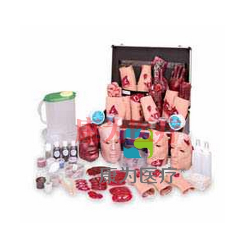 該95件套重創(chuàng)模型元件可進(jìn)行創(chuàng)傷處理練習(xí)。這些用乙烯樹脂制成的傷口,可以粘貼或用繃帶綁在模型人或真實(shí)傷者的身體上。每個(gè)流血的傷口包括一個(gè)用于模擬血液的儲(chǔ)存袋和動(dòng)力泵。用來練習(xí)快速識(shí)別傷口和傷口的伴隨癥狀、訓(xùn)練現(xiàn)場(chǎng)急救、傷口分類。重15千克。