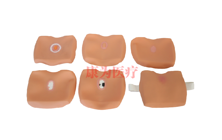 ●模型具有六張臀部外皮,分別顯示壓瘡的動(dòng)態(tài)變化,包含淤血紅潤(rùn)期、炎性浸潤(rùn)期、淺度潰瘍期、壞死潰瘍期等不同階段
