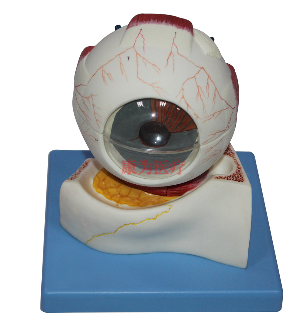 ●該模型在上頜骨上方將眼球水平切,由眼球壁鞏膜、脈絡(luò)膜上、下半側(cè)、角膜、晶狀體和玻璃體等7個部件組成,并顯示眼球壁鞏膜、角膜、虹膜、睫狀體、脈絡(luò)膜和視網(wǎng)膜的構(gòu)造以及眼球內(nèi)容物、眼球外肌、血管和神經(jīng)等結(jié)構(gòu),共有31個部位指示標(biāo)志