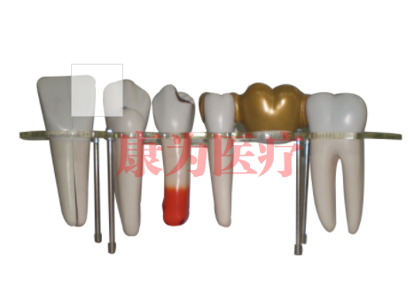 顯示尖牙、可見(jiàn)內(nèi)部結(jié)構(gòu)的切牙、帶根尖炎的前磨牙、帶金牙冠的人工磨牙